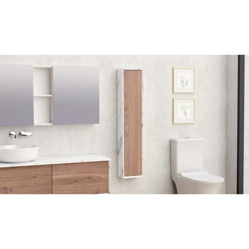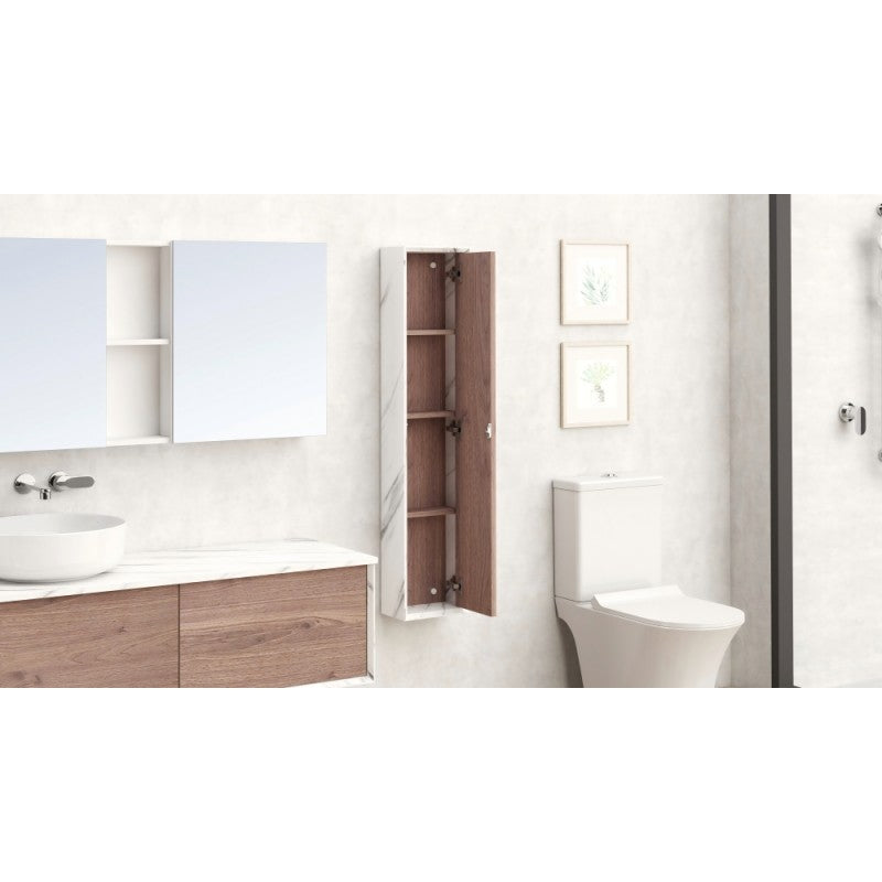 Колона за баня, изработена от висококачествени материали за дълготрайност и стил. Задната част е с дебелина 5 мм шперплат, а другите панели са с дебелина 18 мм. Всички предни панели на шкафа са в черен цвят, което придава елегантен и съвременен вид. Механизмът за отваряне на вратите е с DTC панти с функция "push to open", което осигурява лесно и удобно отваряне без дръжки.