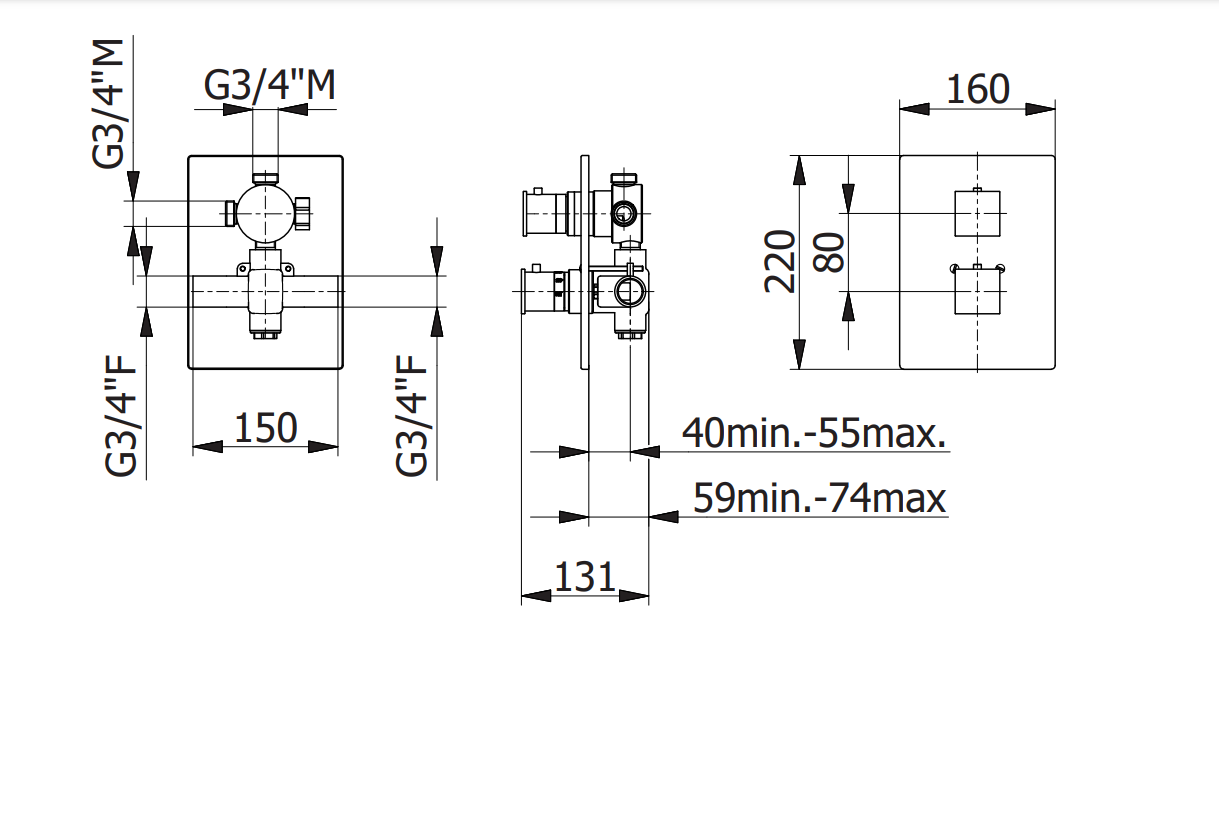 3/4” термостатен смесител за вграждане с 2-пътен въртящ се керамичен превключвател със затваряне и кран за трета посока.