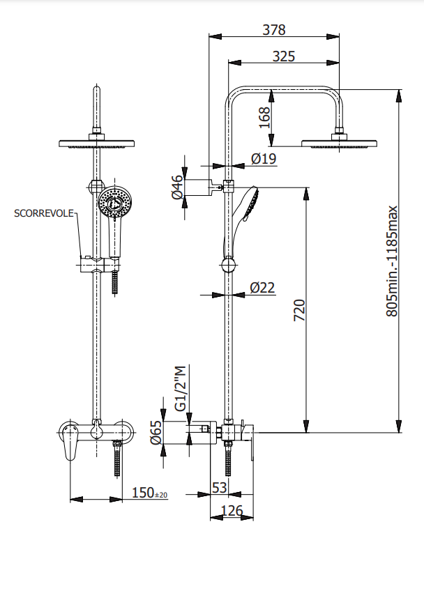 Телескопична душ колона в комплект с едноръкохватков смесител с превключвател, душ слушалка и ръчен душ с дюзи против варовик